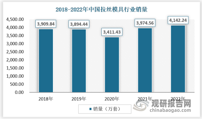 我国已经成为全球制造强国,拉丝模具需求量巨大,2022年销量为4142.24万套。具体如下: