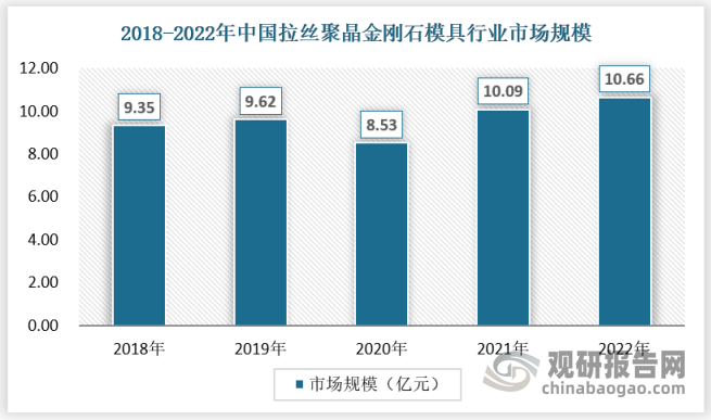 聚晶金刚石(PCD)(微粉)是利用独特的定向爆破法由石墨制得,高爆速炸药定向爆破的冲击波使金属飞片加速飞行,撞击石墨片从而导致石墨转化为聚晶金刚石。聚晶金刚石拉丝模具适合长时间生产,寿命长(比天然钻石模和人造钻石模),适合干式和湿式拉丝。2022年我国聚晶金刚石拉丝模具市场规模为10.66亿元。